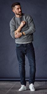 - Sit low on the waist with a regular fit through the seat and thigh and a Straight fit Stretch leg